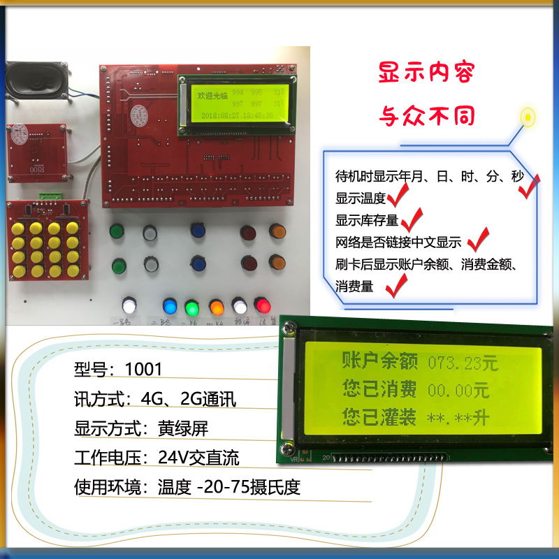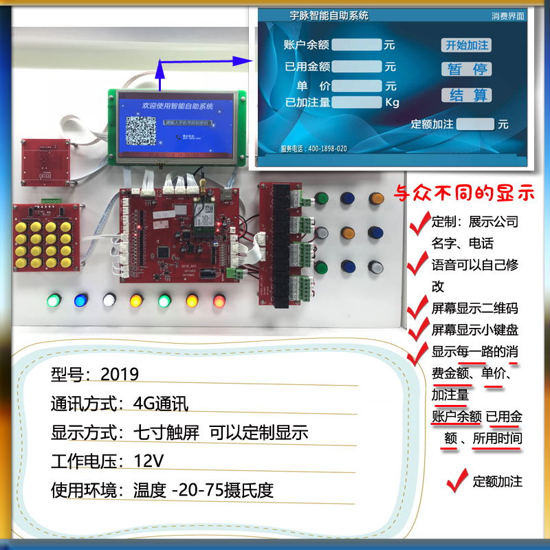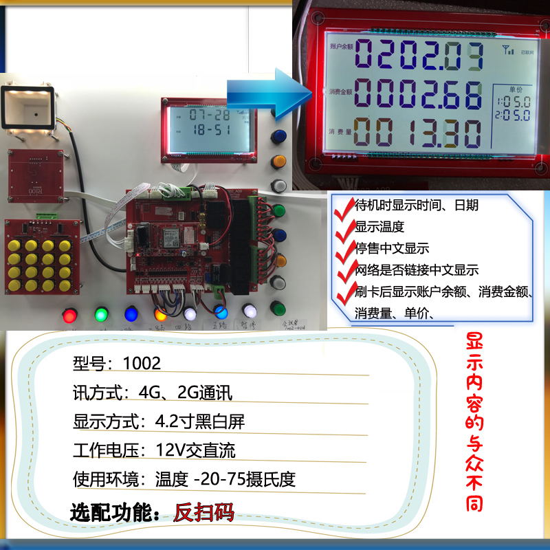 产品功能 :按次消费、单次消费、实时消费,按时间计费或者流量计费,可设置最长的消费时间和最小的启动金额,定时开关机,远程锁机,链接广告机,导航、商城、报警提醒、微信公众号、远程后台管理分享赚钱、商户通管理、远程监控、等级打折、一键拨号、授权管理、GPSD 定位、语音播报、代金券、定额消费、定量消费、双脉冲、打印小票,挂枪结算,元取整,升取整,退费。反扫码。温度控制。